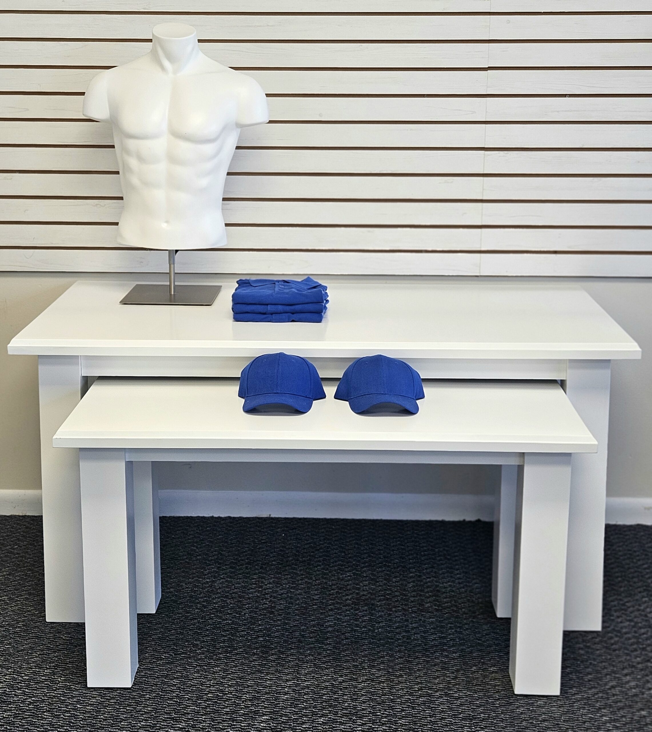 Solid wood nesting tables.  Typical sizes are 30x30x60 and 24x24x48, but other sizes are available. Available in all finishes. Call or email today for your quote.